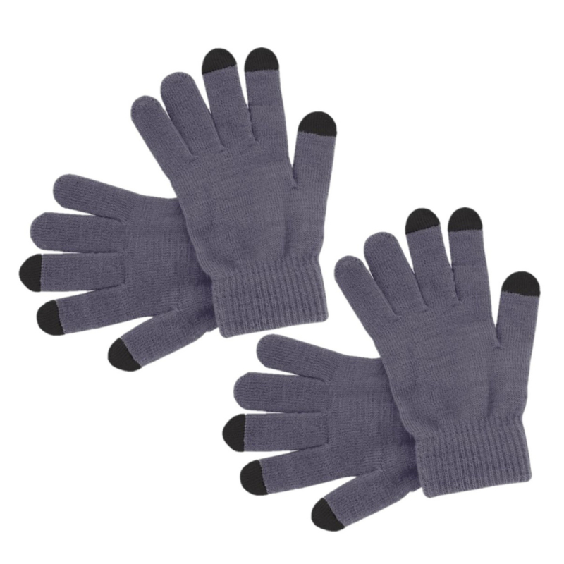 2x paar touchscreen handschoenen grijs voor volwassenen. Met deze handschoenen kunt u uw smartphone gewoon blijven bedienen. Ideaal als het koud is buiten! Bovendien blijft uw touchscreen krasvrij. One size fits most en geschikt voor volwassenen. Materiaal: 100% Acryl. Maatvoering: One size, ongeveer maat S/M. Maat bepalen: Meet de omtrek van de hand zonder de duim en de knokkel. Het meetlint mag niet strak rond de hand, enkel losjes.Maat S/M komt overeen met 17,0 cm tot 22 cm omtrek.