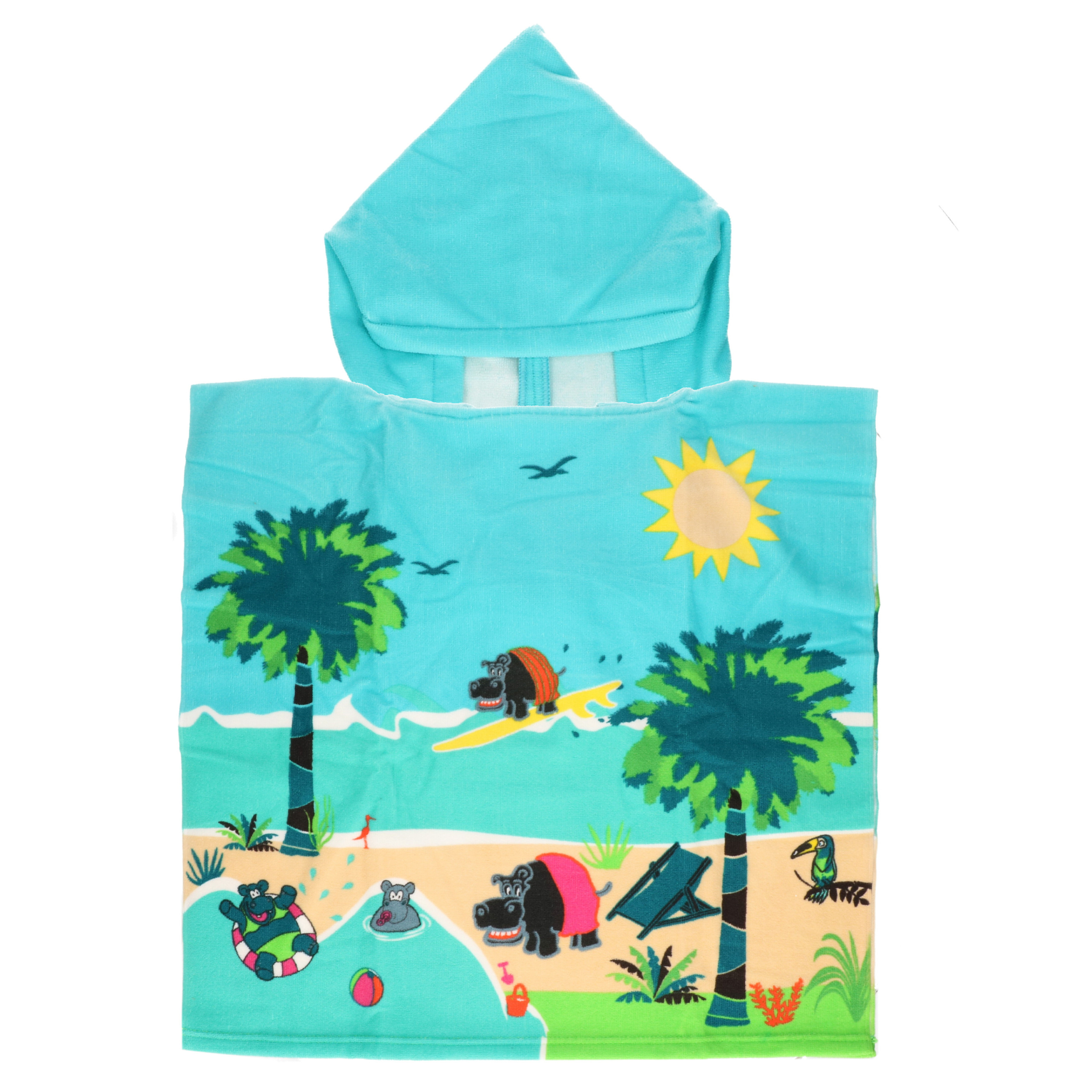 Bad cape/poncho voor kinderen met een nijlpaard print 60 x 120 cm microvezel. De bad poncho heeft een print met nijlpaarden erop. Tevens is de bad cape sneldrogend en zacht. Materiaal: 100% polyester.